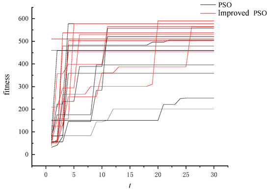 where , , are three particle individuals randomly selected in the population, with ; is the mutant individual; is the scaling factor; and is the perturbation. According to Equation (6), it can be seen that in the early stage of the search due to the randomness of the initial distribution of the particle swarm resulting in a large discrepancy between particles, the traditional mutation method applies a large perturbation to the particles. As the search proceeds, the particle swarm gradually converges, the difference between particles becomes smaller, and the perturbation becomes smaller.