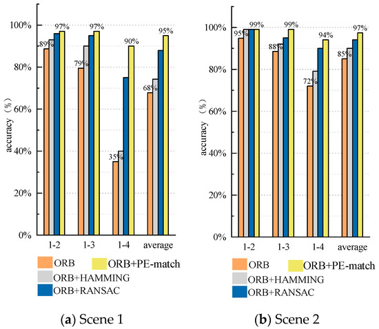 The accuracy of each algorithm is shown in Figure 11, where accuracy refers to the ratio of correctly matched pairs to all matched pairs in the matching results of each algorithm. Image feature matching is performed using the dataset images, with the need to match three image pairs in each scenario, namely 1-2, 1-3, and 1-4, with images becoming more dissimilar as their numbers increase. The matching accuracy of the proposed algorithm is on average 19.5% higher than that of the ORB algorithm, 14.0% higher than that of the ORB+HAMMING algorithm, and 6.0% higher than that of the ORB+RANSAC algorithm.