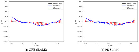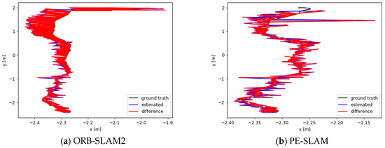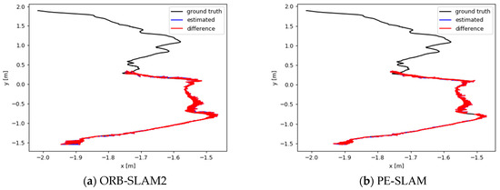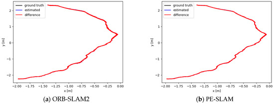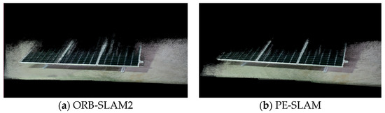 As shown in Table 8, the trajectory errors of both ORB-SLAM2 and PE-SLAM in the Gazebo photovoltaic power station simulation scene are at the centimeter level, indicating that both algorithms achieve good localization accuracy in this scenario. Additionally, PE-SLAM demonstrates better system accuracy, reducing the absolute trajectory error by 11.5% compared to ORB-SLAM2.