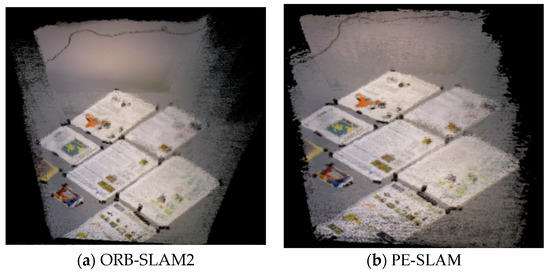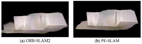 As shown in Figure 26 and Figure 27, we generate four dense point cloud maps based on the two image sequences mentioned above, “In” and “Real”. In this map, ORB-SLAM2 represents the dense point cloud map established after integrating a dense mapping thread into the original algorithm, and PE-SLAM represents the dense point cloud map built from the improved tracking thread. The mapping results of each sequence are shown in the following image.