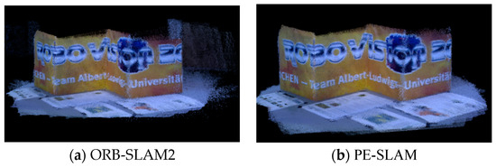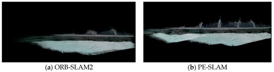 The map established by PE-SLAM reduces the lateral and angular point cloud overlaps aligned with the camera motion direction compared to ORB-SLAM2. This reflects that the camera poses obtained by the improved algorithm are more accurate, allowing for better tracking performance in this scene. The established map shows a small amount of longitudinal overlaps inconsistent with the camera motion direction, with outdoor scenes exhibiting significantly more longitudinal overlaps than indoor scenes. This is mainly due to deviations in the camera’s depth estimation, which become more pronounced under strong outdoor lighting conditions. As shown in Figure 19, the mapping area of PE-SLAM is larger than that of ORB-SLAM2, which is due to tracking failures midway with ORB-SLAM2, indicating that PE-SLAM has a better robustness.