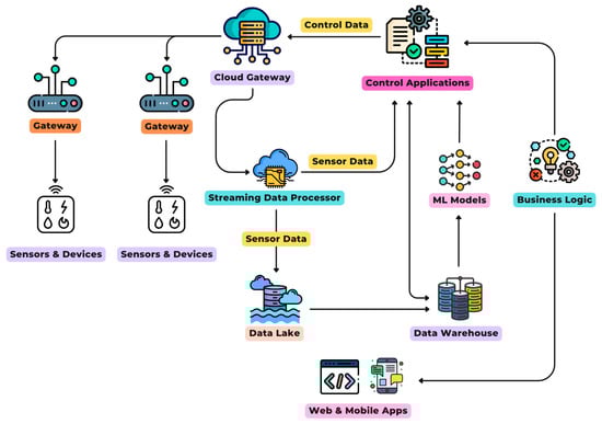 Figure 1 illustrates the current state of the IoT architecture. This IoT architecture integrates several critical components to effectively manage and utilize connected devices’ data. At its core, “things”—objects equipped with sensors and actuators—collect and act on data. These objects can range from household appliances to industrial machinery, with sensors sometimes positioned remotely to monitor the surrounding environment. Data flows from these things to the cloud via gateways, which facilitate connectivity and preprocess and filter data to reduce the volume sent to the cloud while transmitting control commands from the cloud to the things. A cloud gateway further compresses these data and ensures secure transmission to IoT servers, adapting to different protocols as necessary. Within the cloud, a streaming data processor manages data transfer to a data lake and controls applications, ensuring there is no data loss or corruption. The data lake stores vast amounts of raw device data, which, when needed, are transferred to a big data warehouse, where they undergo further filtering and structuring for detailed analysis. Data analysts utilize this structured data to extract insights, identify trends, and improve system efficiency. Moreover, machine learning (ML) is employed to develop sophisticated models for control applications, which are regularly updated based on new data to enhance decision-making processes.