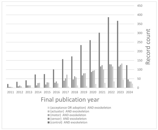 The research field of exoskeleton + (motor/control/actuator/sensor), which is typical for engineering sciences, is much more covered than the field of acceptance (exoskeleton AND acceptance OR adoption).