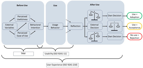This implies that a person, well before they first use the product (or other services), will evaluate it. This judgment can therefore form both the basis for and the start of the acceptance process. Once this process has been completed, the person will be able to decide, even if this judgment is made for the most part unconsciously, whether or not acceptance is given. Once the decision to accept has been made, the next stage, namely adoption [28], can begin, which should be the objective for any product, and particularly for exoskeletons. This theory is generally the basis for different acceptance model types.