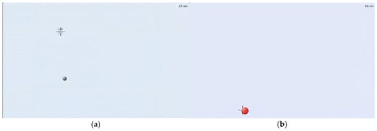 Two types of tasks were analyzed as the main test (flicking and tracking). Before the test, each participant had five practice trials for each task. Then, three trials for each task were carried out and registered. The order of the tasks was randomized using opaque envelopes []. Both tasks were developed by the researchers using free software (https://aim400kg.com/ (accessed on 9 April 2024)), which has been used in a previous study []. The flicking task consisted of clicking on the circles that randomly appeared on the screen as quickly as possible. The duration of the task was 60 s; each time a circle was clicked on, it disappeared and another one appeared in a different place on the screen (Figure 2a). The circles had a dimension of 5 units. The tracking task consisted of keeping the cursor over the circle shown on the screen, which moved randomly with a straight path at a constant speed along the vertical and horizontal axes (Figure 2b). The duration of the task was 60 s and the circle had a dimension of 9 units. The goal of this task was to observe the participant’s ability to pursue a moving target with the mouse for as long and as accurately as possible.