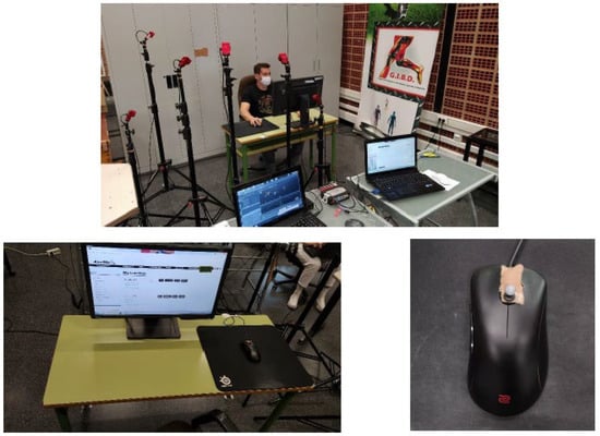 A computer connected to a 24-inch monitor (BenQ Zowie XL2411, BenQ, Eindhoven, The Netherlands) (144 Hz) was used to carry out the tasks. The participants sat in an adjustable chair and used an optical mouse at 800 DPI (BenQ Zowie EC1-A, BenQ, Eindhoven, The Netherlands) (90 g) on a rectangular mat with a smooth surface (Steelseries QCK Heavy, SteelSeries, Ballerup, Denmark). Three-dimensional kinematic analysis of the mouse during the requested tasks was performed using a 6 optoelectrical camera system (Optitrack’s Flex 3, NaturalPoint, Inc., Corvallis, OR, USA), sampling at 100 fps, and a marker on the mouse (Figure 3). The recording volume space was previously calibrated.