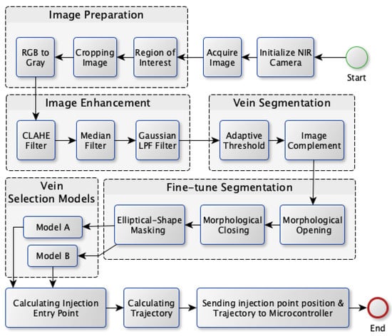 Intravenous (IV) cannulation is a procedure where a needle is inserted into a vein to draw blood or inject fluids and medications []. Approximately 80% of hospitalized patients undergo intravenous therapy as a routine procedure for clinical testing []. Currently, only trained medical professionals are allowed to perform IV cannulations as it requires preciseocalization and detection of veins, proper insertion of the needle, and adequate introduction of fluids or blood withdrawal. However, it is considered a challenging procedure and prone to human error. Improper venipunctureeads to many complications, including bleeding, swelling, infection, and damage to the vein [,]. IV insertion becomes more challenging among children and elderly patients, people with hairy skin or dark skin tone, and obese patients [,]. This is because the subcutaneous veins are not clearly visible in the visibleight spectrum [,]. As stated in [], the success rate of IV cannulation from the first time in children ranges from 53% to 76%. Moreover, multiple attempts to perform venipuncture may cause vein thrombosis, and hematoma [,].