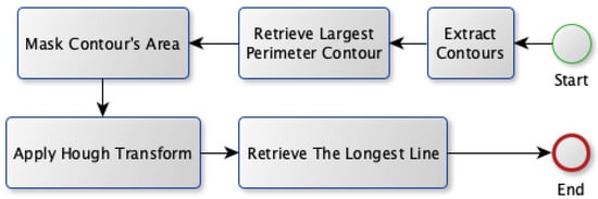 Two approaches are proposed in order to select the best candidate vein: Model A and Model B. Both models share the first four stages for the vein extraction module; however, they propose different approaches for the vein selection process. The block diagram for the first approach (Model A) is shown in Figure 7. Model A relies on finding the most visible vein that isocated inside a region with aarge perimeter (thick edge). First, it gets all the contours that exist in the binary image. Afterward, it searches for the contour that has theargest perimeter. Next, the Hough transform is applied to find allines existing in that contour. It transforms the image into a parameter space using both rho and theta. These parameters represent straightines in polar coordinates. Theongestine fitting inside that contour is used as the selected vein.