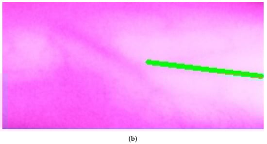 Theast category (Group F) represents test results that indicate false vein selection from both models. This group has about 8.7%, corresponds to two test images. One of the two images is shown in Figure 22. Although Model B suggested twoines, as shown in Figure 22, bothines represented false vein selection. For the second image, Model A did not provide accurate vein selection, while Model B highlights two veins. Although these selections corresponds two accurate veins’ocations, they are not coincident. Therefore Model B failed in outputting the correct vein.
