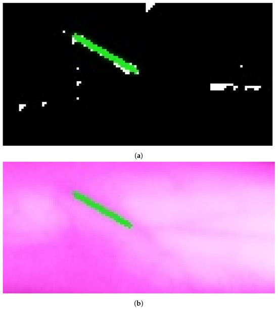 Stage 5, vein selection using Model B for image with twoevels downsample: (a) highlighting vein for binary image; (b) detected vein in the cropped image. The redine and greenine in (a,b) correspond to the vein extraction’s output that is displayed through the segmented and captured images respectively.