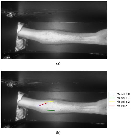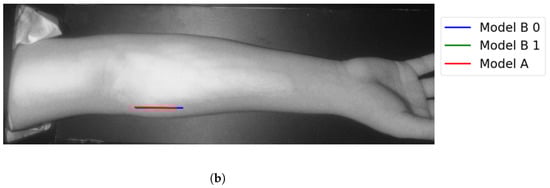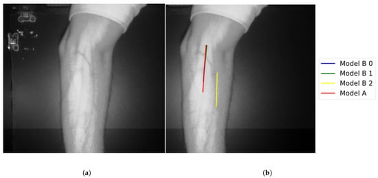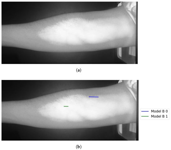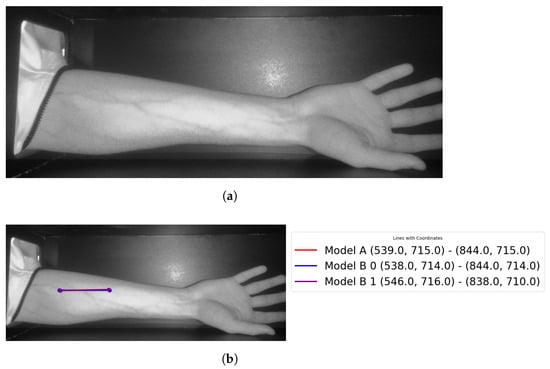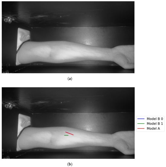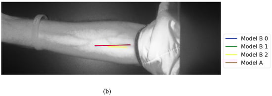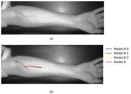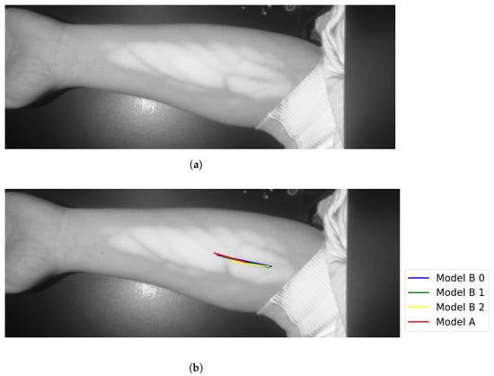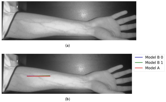 Model B correctly identifies vein selection for Image 3: (a) original image; (b) models’ output.