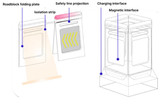 Figure 1. Preliminary design drawing. The pictures detail the structure of the original design of the R-barricade; it is composed of a roadblock folding plate, isolation strip, safety line projection, charging interface, and magnetic interface (the picture is drawn by the author).