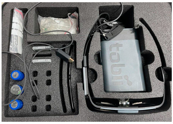 Figure 3. Tobi Pro Glasses 2 Wearable eye tracking device. The image shows the Tobi Pro Glasses 2 Wearable eye-tracking device, which consists of glasses, HDMI cable, and an inbuilt SD memory card.