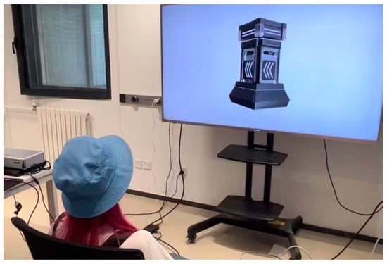 Before the experiment begins, the observation time for each picture needs to be determined. If the time is too short, participants will not be able to fully observe the detailed design; if it is too long, the difference in the observed data for each picture will be too small. Therefore, it was essential to conduct a preliminary experiment. Ten participants were invited to observe similar pictures in the preliminary experiment, and an observation time of 7 s per picture was determined. A formal experiment was conducted next. Pictures were imported into Tobii Studio, and each picture was observed and played in a certain order for 7 s. The position of the participants was adjusted so that the distance between the eyes and the screen was maintained at about 64 cm. The current participant’s eye movement habitus was then recorded through a 9-point calibration. Participants were then asked to view all the pictures on the screen, and the process was recorded, as shown in Figure 5.