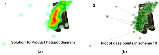 Figure 6. The collection rates of some of the records. They should be listed as (a) Solution 10 Product hotspot map, red represents the longest gaze, followed by yellow, the shortest is green; (b) Plot of gaze points in scheme 10. The number and length of gaze reflect the importance and interest of the part of the area being tested.