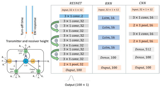23]. The last neuron of each channel represents the heights of the transmitter and receiver coils. The final input data shape is 32 × 2, where each channel contains 62 neurons for the cut-off time and electromotive force data, and 2 neurons for the height data. Observation elevations of receiving are randomly set to be uniformly distributed in the range [0, 30] m, and the height of the transmitting coil is 10~30 m higher than that of the receiving coil. The number of sampling points is variable and distributed uniformly between 20 and 31. The cut-off time points are distributed logarithmically between the earliest and latest shut-off times, and the earliest and latest cut-off times are also variable, following a logarithmic uniform distribution: