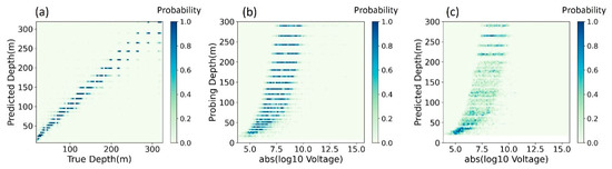 Figure 2b,c represent the relationship between labeled depth and predicted depth with the IEF at the last cut-off moment, respectively. As the late-time IEF decreases (represented by negative values after taking the logarithm, thus larger values on the x-axis indicating smaller IEF), the probing depth gradually increases. This is because a faster decay of the electromagnetic field indicates higher resistivity, leading to greater penetration depth of the electromagnetic field. The significant similarity observed in
