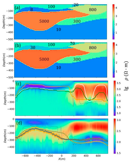 Figure 3. The differences between the two models lie in the distinct electrical resistivity contrasts at a depth of 100 m and in local regions near the Earth’s surface. In model I, the probing depth on the left side is limited due to the shielding effect of the conductivity layer. Conventional algorithms are affected by inversion model discrepancies near the shallow low-velocity zone (