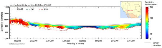 27], and the probing depth is obtained through the inversion model. The dots in the profile represent the probing depth predicted by the DL models. The variation trends of the predicted probing depth by the three DL models are generally consistent with the probing depth calculated through the inverted model. Specifically, in areas with lower overall resistivity, the predicted probing depth is shallow, while in areas with higher overall resistivity, the predicted probing depth is greater. This alignment confirms the effectiveness of the DL models in predicting the probing depth based on the field airborne transient electromagnetic measurements.