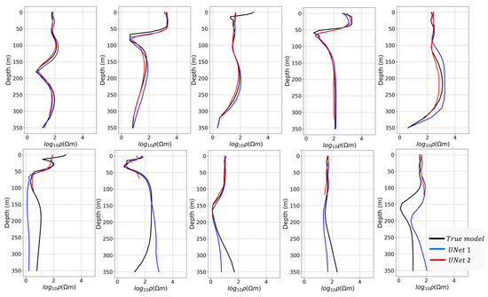 Figure 8 illustrates several examples illustrating the determination of the subsurface resistivity models from the test dataset. Some models obtained from the