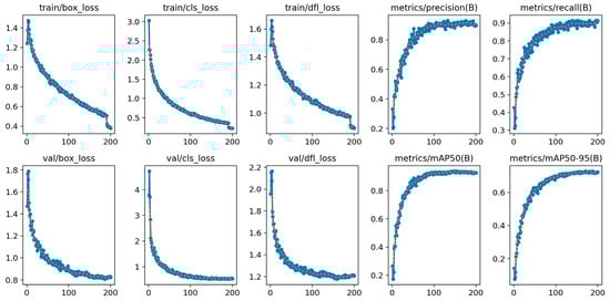 Figure 2 demonstrates the values of box loss (box_loss), class loss (cls_loss), and distribution focal loss (dfl_loss) at each epoch during the YOLOv8m model training process. The box_loss measures the difference between estimated bounding box and ground–truth bounding box coordinates. The cls_loss calculates the error in the probabilities of the predicted class compared to the ground–truth class. The dfl_loss offers more informative and accurate estimation of the bounding box. The total loss, which is a combination of these losses, was decreased on both the training and validation dataset during the training process. Hence, precision, recall, and mAP metrics were gradually enhanced with the increasing epoch.