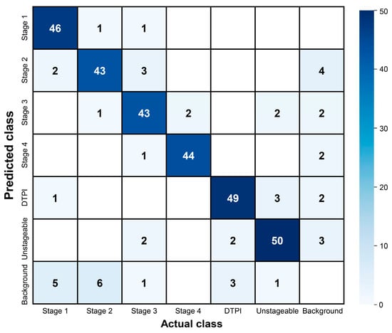 Confusion matrix of pressure ulcer classification by the trained YOLOv8m model.