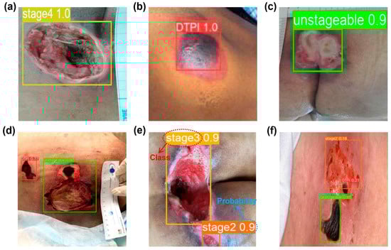Examples of output images by the trained YOLOv8m model are described in Figure 4. Both the bounding box outlining each pressure ulcer area and the corresponding stage with classification probability were simultaneously displayed. Individual pressure ulcers such as stage4, DTPI, and unstageable were successfully detected in the test images with a single class (Figure 4a–c). When there were two or more stages of pressure ulcers in the test images, the trained YOLOv8m model was also able to encase the ulcer region and identify its stage (Figure 4d–f). Hence, the trained YOLOv8m model provided reasonable judgments to predict the affected area and the severity of the individual pressure ulcer.