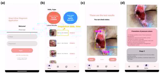 Development of a mobile app for detecting pressure ulcers. (a) Log-in page. (b) App home page. (c) Detection results after inspection. (d) Provision of instructions and information according to the results.