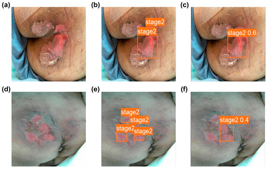 Compared with other classes, relatively low classification performance was shown in stage 2 (Table 5) because the trained YOLOv8m model misclassified stage 2 (actual class) as mainly background (no detection) class (predicted class, Figure 3). Representative failure cases of detecting stage 2 were described in Figure 6. There are multiple regions of stage 2 in ground–truth labels (Figure 6b,e). However, the YOLOv8m model detected not multiple small regions but one large region of stage 2 (Figure 6c,f). This implies that more magnified or high-resolution images can enhance the pressure ulcer detection performance of the model.