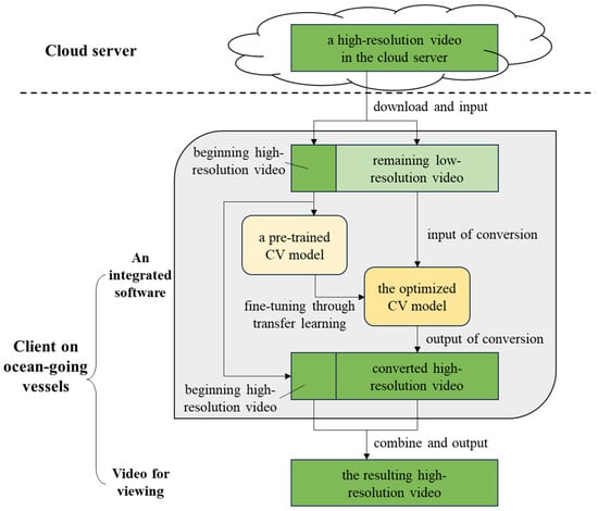 Specifically, we pre-train a CV model based on a large amount of video sample data to convert low-resolution videos into high-resolution ones. When crew members on ocean-going vessels watch videos online, a software tool (embedded with the pre-trained CV model), first loads the high-resolution frames of the beginning portion of the video and the low-resolution frames of the remaining portion. For example, it loads the first 10% of the video in high resolution and the remaining 90% in low resolution. The first 10% high-resolution part is used to fine-tune the built-in pre-trained CV model through transfer learning, as the specific features of different types of videos, such as news programs and movies, may vary. The optimized CV model is better able to adapt to the characteristics of the particular video after transfer learning, and then it converts the remaining low-resolution part into a high-resolution one; the converted remainder is then combined with the first 10% part to result in the final video for viewing by the crew members. The entire process, including video loading and CV model fine-tuning, is accomplished automatically in the software. While the resulting video may differ from the original high-resolution video, this method can enhance the online video viewing experience to some extent while conserving network resources. For example, a high-resolution movie requires 2 GB of data usage, but using this method may only require 0.5 GB of data while providing a similar viewing experience. The flowchart of our proposed novel solution utilizing a CV model is shown in Figure 1.