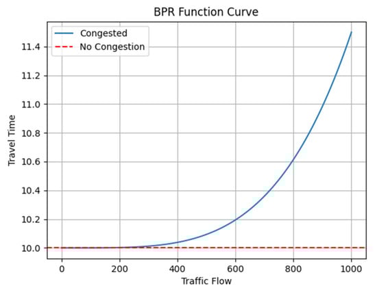 The BPR impedance function is a classic traffic flow equation that provides a concise and efficient description of the relationship between road traffic flow and travel time. Consequently, this model has extensive application prospects in traffic planning, congestion management, and traffic flow optimization. Initially, proposed by the BPR in 1964 [9], the BPR impedance function is used to evaluate traffic congestion levels and road operating efficiency. The primary advantage of the BPR impedance function lies in its accurate depiction of road impedance and its excellent mathematical properties, making it one of the most widely used traffic flow models internationally.
