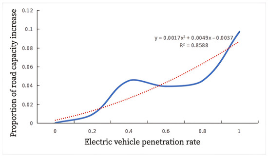 In the BPR base function, a fixed value C0 in Formula (3) is used to represent the actual capacity of the road section. However, in practice, different percentages of EVs will result in different impacts on the capacity of the road. Through the simulation of data [33], it was found that there is a certain relationship between the penetration rate of EVs and C0. The simulation results show that as the penetration rate of EVs increases, the road capacity also increases accordingly. We fit this relationship based on a function diagram, as shown in Figure 2, where the red dotted line represents the fitted trend line, and the Bev-C0 function is shown in Formula (3).