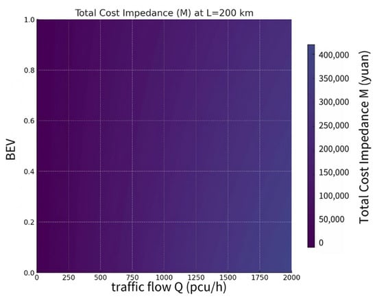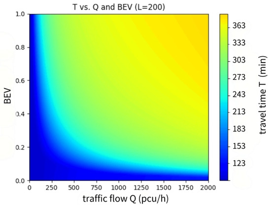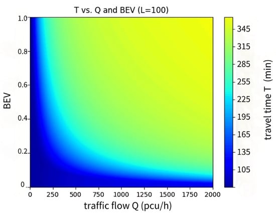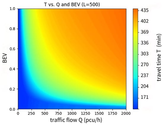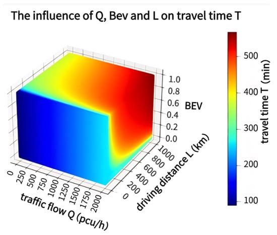 As illustrated in Figure 3, as Q increases, T increases nonlinearly. This indicates that the impact of traffic congestion on travel time is most significant for high traffic flows. The impact of BEV on T depends on Q. At low traffic volumes, the penetration rate of EVs has little influence on travel time. However, under high traffic conditions, an increase in the penetration rate of EVs leads to an increase in the charging time, thus extending the travel time. The influence of L on travel time is linear, and the travel time increases linearly with increasing mileage.