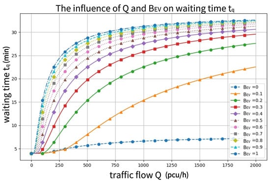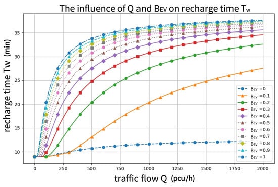 When BEV is low (e.g., BEV = 0 to 0.3), the replenishment time shows a relatively slow upward trend with increasing traffic volume. In the small range of Q, the replenishment time slowly increases. For example, when Q < 500, tq increases slowly. This shows that for a low penetration rate of EVs, the number of EVs on the road is small, the vast majority of vehicles are still fuel-powered vehicles, the number of charging piles is sufficient relative to the number of EVs, the usage rate of charging piles is low, and a vehicle does not need to wait for a long time to complete the charging process; therefore, the time spent at a recharge node is relatively short.