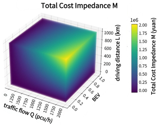 Similarly, to intuitively show the impacts of Q, L, and BE) on the travel cost (M), the drawing function in Python is used to produce a three-dimensional thermal map. The x-axis of the graph represents Q, the y-axis represents BEV, the z-axis represents L, and the color of the data points represents M. As shown in Figure 6, the color shading indicates the total cost.