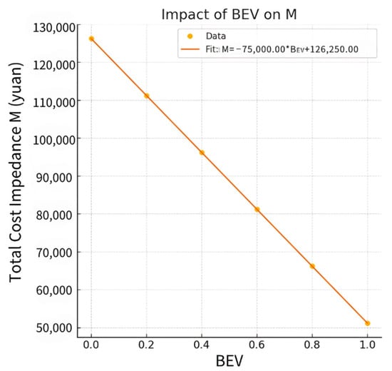 The fitting function shows that the effect of BEV on M is linear, with a coefficient of −75,000.00. This means that for every 1 unit increase in the proportion of electric vehicles, the total cost is reduced by 75,000.00 yuan. The energy consumption per mile by an EV DEV is lower than the energy consumption per mile of a GV DGV. As the proportion of electric vehicles increases, the total cost decreases. Therefore, increasing the proportion of electric vehicles will help reduce the overall cost of travel.