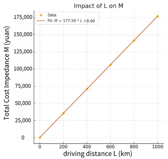 The fitting function shows that the influence of L on M is linear, and the coefficient is 177.50. This means that for each additional kilometer of driving, the total cost increases by 177.50 yuan. The greater the mileage is, the greater the energy consumption and usage costs of the vehicle, resulting in an increase in the total cost. This suggests that the distance traveled has a direct impact on the total cost; the longer the distance traveled is, the greater the total cost. At the same time, the impacts of the total number of vehicles and mileage on the total cost have the same slope and intercept, which is reasonable because the increase in cost is the same in both cases given the proportional relationships between these parameters. An increase in the proportion of EVs will significantly reduce the total cost, which is also expected.