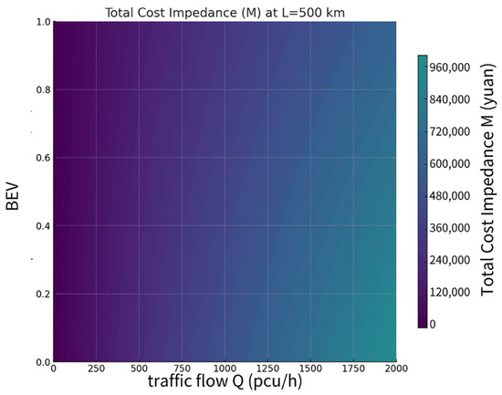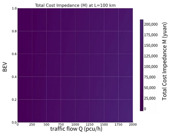 Based on the information provided in Figure 6, a value of L = 100 is used to produce Figure 11. Figure 11 shows the correlation between the total cost and BEV. As BEV increases, there is a gradual decrease in total cost, attributed to reduced energy consumption per unit mileage of EVs. Specifically, when BEV approaches zero and GVs constitute a significant portion of the total traffic flow, the total cost is comparatively higher. Conversely, as BEV approaches one and EVs account for a larger proportion of the total traffic flow, the total cost decreases. Further examination of the color gradient suggests that an increase in the total number of vehicles coupled with an increase in the proportion of EVs results in a relatively slow growth rate for the total cost. This underscores the substantial impact of promoting EV usage for reducing overall costs.