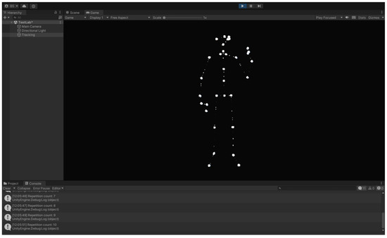 The Unity editor version used was “2022.3.0f1 LTS” due to recommendations provided by LightBuzz. All coding was performed in the C# language, native to Unity, using Visual Studio 2022, running on the Windows 11 operating system. The libraries and architecture provided by Unity and those of the LightBuzz SDK were used. These libraries are used with the “LightBuzz.BodyTracking” workspace. Additionally, once the tests were implemented in this software, an accuracy percentage of 95% was obtained in the initial laboratory tests.