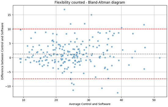 Figure 12, Figure 13, Figure 14 and Figure 15 quantify the difference in means between both methods analyzed. The values vary in the flexibility test from −7.5 to 10 repetitions, in the biceps curl from 1.75 to 1.80 repetitions, and in the abdominal test from −0.7 to 0.7 repetitions. In the horizontal jump test, the limits of agreement presented a slight bias about the other tests; despite this, they are within the limits of agreement. In general, broad limits of agreement are observed in the four physical tests.