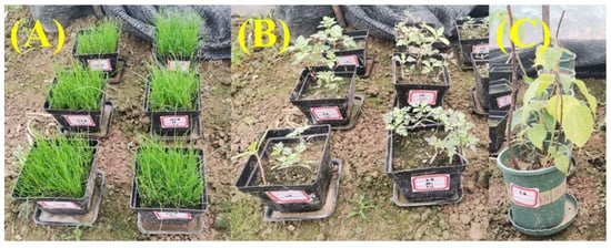 The optimal dosage of stabilizer materials was determined based on the research of the optimal formulation. Potted plants were treated with different dosages of 1%, 3%, 5%, 7%, 9%, 13%, 15%, 17%, and 19% (based on soil quality) to stabilize the above stability and plant seeding. Then, soil samples were collected for further analysis. The optimal dosage of the iron–manganese material was established based on maximizing the decrease in bioavailable heavy metal concentrations in the soil. After the growth cycle, the harvested plants were air-dried, and each plant was individually sealed for subsequent measurement of bioavailable heavy metal content. All experiments were conducted in an artificial climate incubator (25 °C with 75% humidity and full illumination).