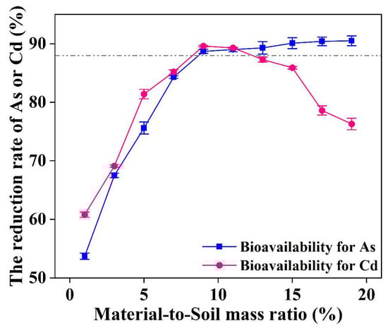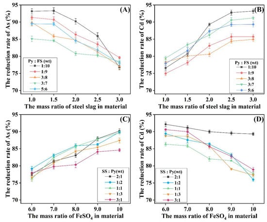 Figure 4A,B showed the impact of varying steel slag ratios. A lower ratio enhanced arsenic stabilization, increasing the bioavailability reduction from under 80% to over 90%. Conversely, reducing steel slag detrimentally affected cadmium stabilization, decreasing the bioavailability reduction from over 90% to under 80%.