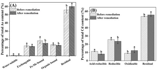 To gain a deeper understanding of the changes in heavy metal properties in the soil of the contaminated area after material–plant combined remediation, an analysis of the chemical forms of As and Cd in the soil before and after remediation was conducted. The results are shown in