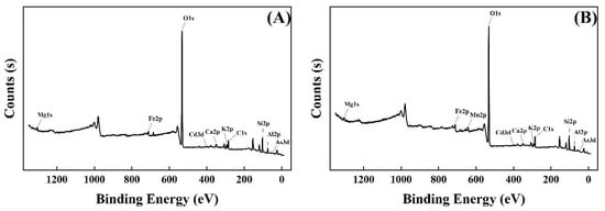Figure 7A,B represented XPS full spectra of the soil before and after remediation, respectively. Upon comparing the two figures, it was observed that the peak intensities of Si2p at 103.11 eV and Al2p at 74.93 eV decreased, indicating the involvement of these elements in the stabilization process of heavy metals. The mechanism was that SiO