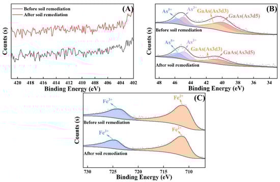 By comparing the fine spectra of each element before and after remediation, notable changes were observed in Cd, As, and Fe. The detailed XPS spectra results for Cd, As, and Fe are presented in