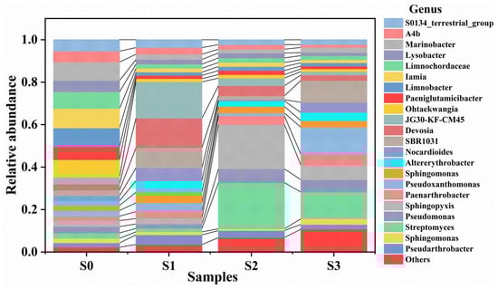 Notable shifts in the dominant bacterial genera were evident when comparing soil samples before and after remediation. Initially, predominant genera included S0134_terrestrial_group, A4b, Marinobacter, Ohtaekwangia, Lysobacter, Limnochordaceae, Paeniglutamicibacter, Iamia, and Limnobacter. Post-remediation, the prevalent genera shifted to JG30-KF-CM45, Devosia, SBR1031, Nocardioides, Pseudarthrobacter, Altererythrobacter, Pseudoxanthomonas, Sphingomonas, Paenarthrobacter, Sphingopyxis, Pseudomonas, and Streptomyces.