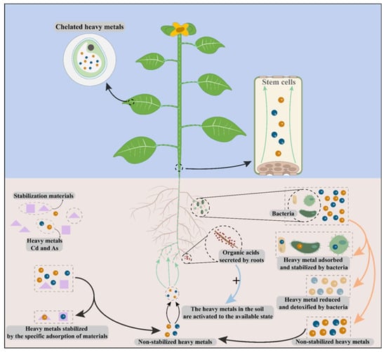 26]. During the remediation process, plant roots produce substances such as small molecular organic acids under bacterial action, promoting heavy metal dissolution. When the dissolution rate of heavy metals exceeds the extraction rate by plants, the risk of heavy metals diffusing into the external environment remains high. Therefore, “assisted natural remediation” became a new trend in phytoremediation technology. This approach involves adding amendments to chelate, adsorb, precipitate, and chemically react with metal ions to accelerate the remediation process, thereby reducing the bioavailability of metals [