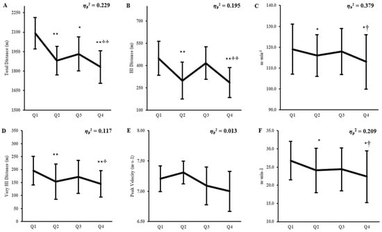 p2 = 0.137) for all metrics, apart from maximal velocity and percentage of peak velocity. Post hoc analysis revealed a consistent trend for a decrement in locomotion across the second and fourth quarters for total distance (TD, η