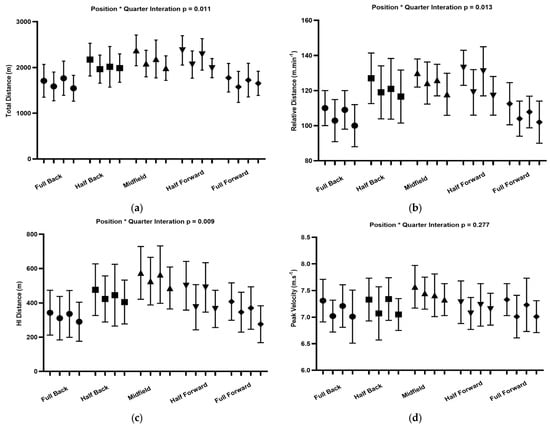p2 = 0.159), with half-backs, midfielders, and half-forwards covering increased distances and having higher decrements in locomotor performance across the second and fourth quarters, respectively. Finally, a significant interaction between position and quarter was observed for the mechanical variables of accelerations (F = 3.103,