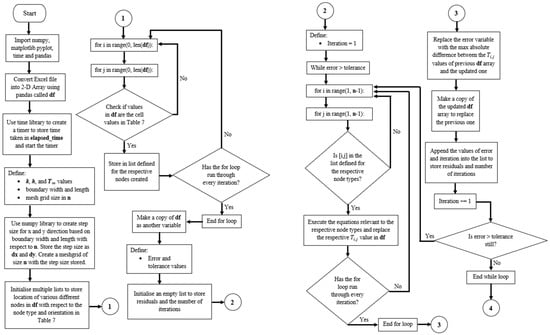 Based on the equations shown in Table 1, the temperature value of the nodes, , can be obtained via rearranging the equation such that is now the subject. It should be noted that k is the thermal conductivity of the chosen material, h is the convection heat transfer coefficient and is the ambient temperature.